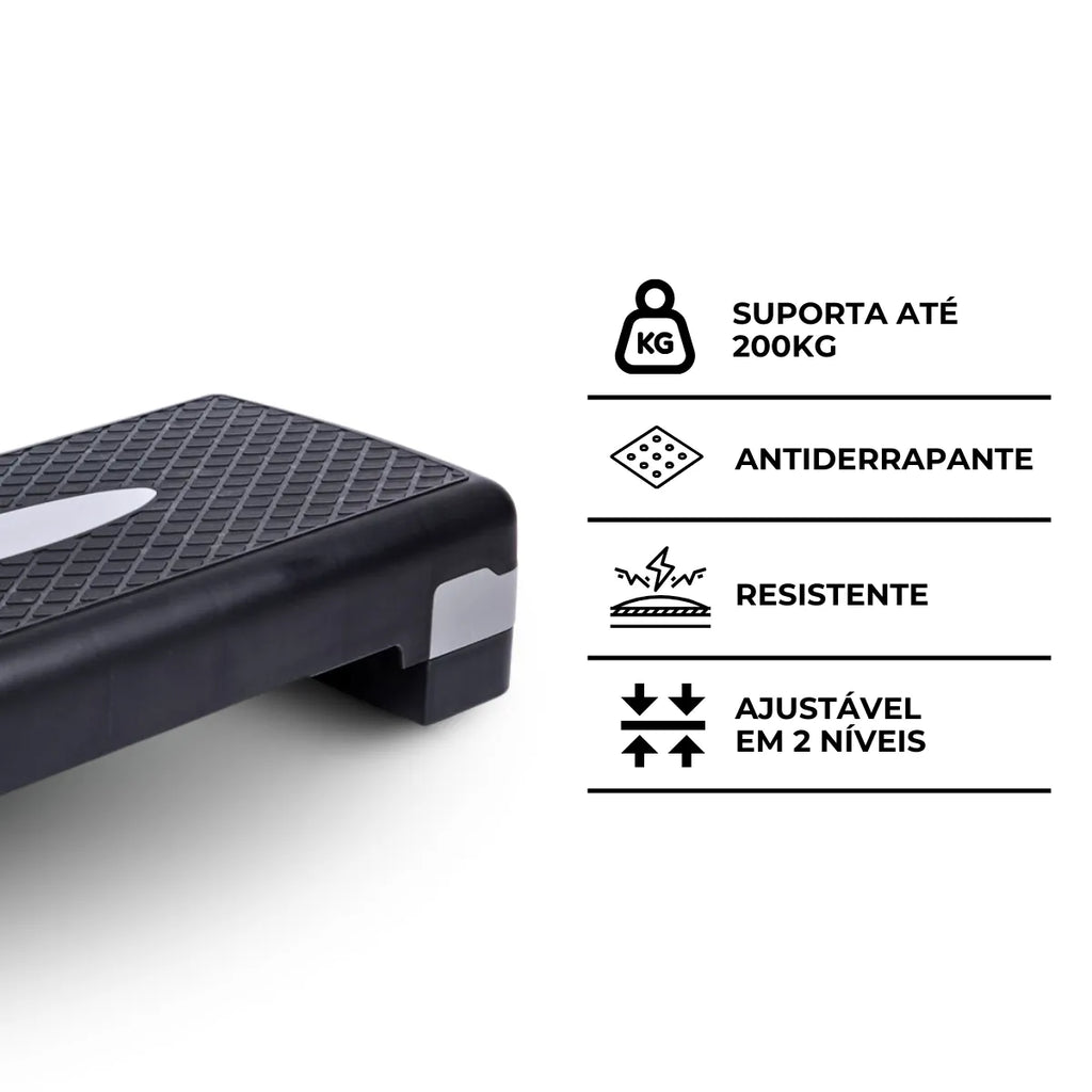 Fabricado em polietileno de alta qualidade, o step suporta até 200 kg, oferecendo segurança e estabilidade mesmo nos exercícios mais intensos.